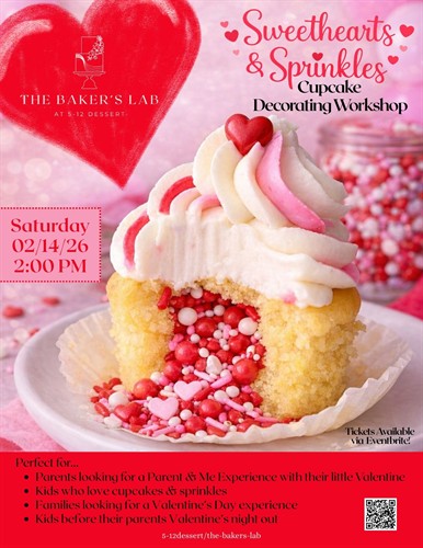 Join us at The Baker’s Lab at 5-12 Dessert for Sweethearts & Sprinkles — a fun, festive, hands-on cupcake decorating experience designed especially for little Valentines.