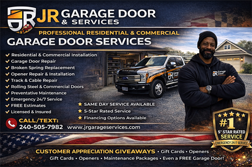 JR Garage Door & Services, LLC is a licensed and insured, family-owned garage door company proudly serving Charles County, Southern Maryland, Washington, DC, and Northern Virginia. For over 10 years, our family has provided garage door repair, installation, maintenance, and emergency service for homes, commercial properties, auto shops, HOAs, and government facilities.