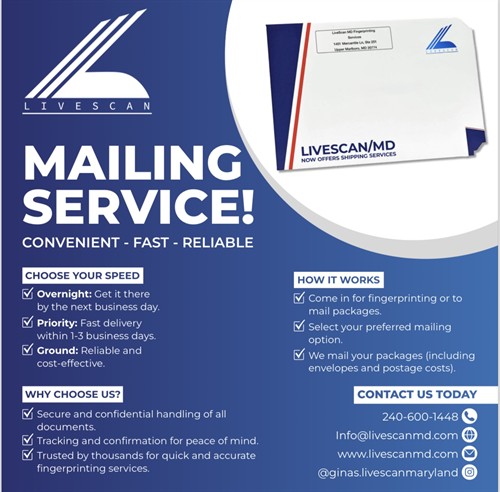 LiveScan MD Fingerprinting Services offers a wide range of convenient options. We handle State of MD live scan background checks, FBI fingerprint cards, FBI departmental orders, and Florida LiveScan. These checks are perfect for anyone applying for jobs at the state, federal, private, or public level, as well as for those pursuing professional licenses. We also provide DOT and Non-DOT drug testing, notary and loan closing services, and can prepare Power of Attorney documents. Our professional passport photos for U.S. passports can double as work IDs or security badge photos. Plus, we’ve recently added ground, priority, and overnight mailing, making us a true one-stop shop.